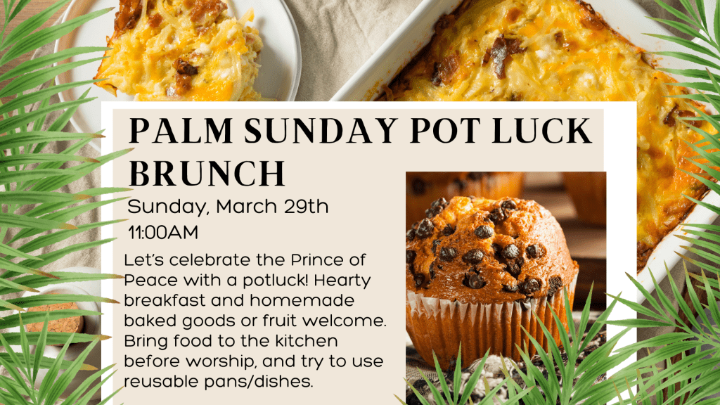 Let’s celebrate the Prince of Peace on Palm Sunday with a potluck! Hearty breakfast and homemade baked goods or fruit welcome. Bring food to the kitchen before worship, and try to use reusable pans/dishes. Last names A-K bring baked goods, or fruit, L-Z bring egg, meat or vegetarian breakfast entrees to the kitchen before worship, identified by name with details (ie with nuts, vegan, etc), and please use reusable dishes. To help or have questions, email Jan!