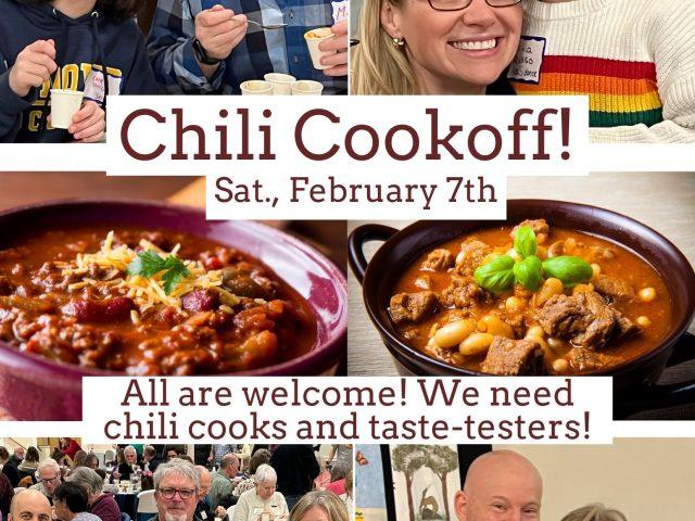 Come to South Church's annual Chili Cook Off. Taste testing and entertainment begin at 5:30pm, cooks arrive at 5pm with a crockpot of chili (or chowder/soup).